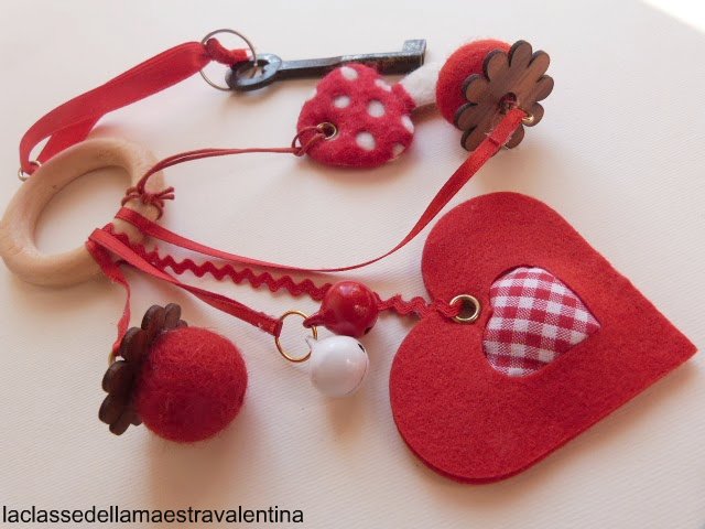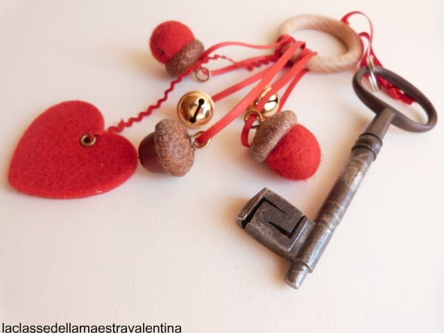 una grande chiave attaccata a un portachiavi feltroso, ricco di elementi