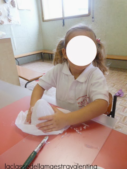 Per realizzarli occorre l'involucro delle uova di Pasqua, (quelli un po' a punta) dei cerchi di carta crespa bianca e tanta tanta colla vinilica.