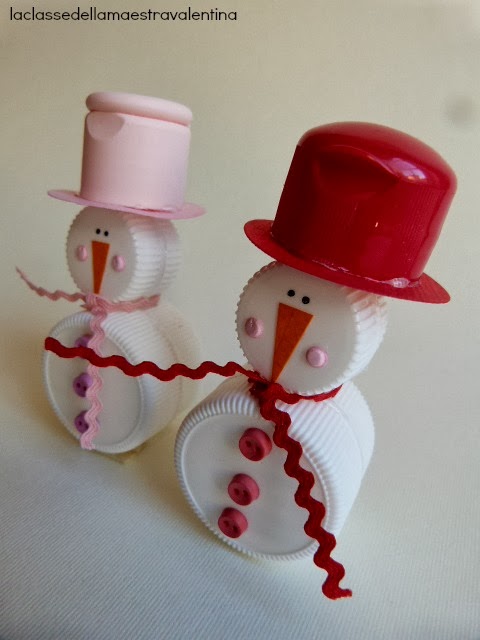 Concludo la lunga carrellata dei pupazzi di neve mostrandovi che cosa si può realizzare coi i tappi di plastica.