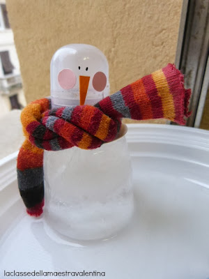 sistemare la testa (capsula ovetto kinder) sul corpo ghiacciato e una sciarpina (pezzo di calza)