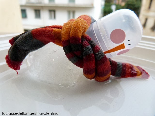 sistemare la testa (capsula ovetto kinder) sul corpo ghiacciato e una sciarpina (pezzo di calza)