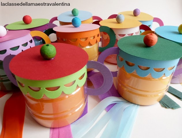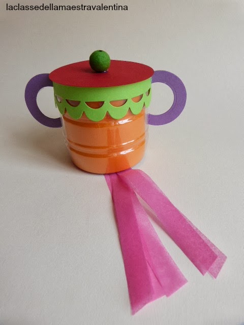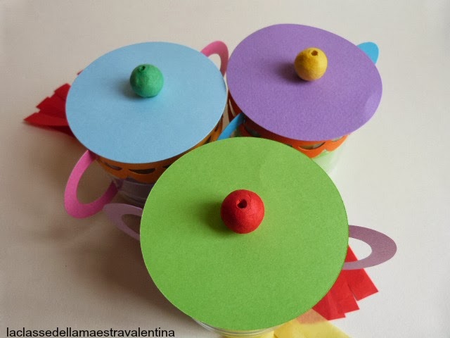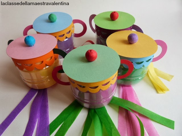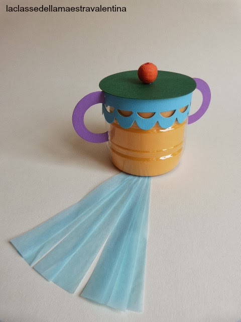 Per realizzare queste coloratissime pentolacce vi occorrono delle bottiglie di latte, degli avanzi di cartoncino, della carta velina e delle palline di carta pressata.