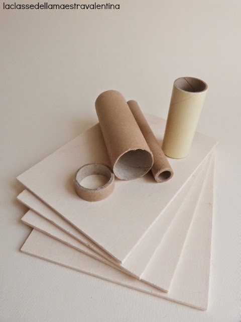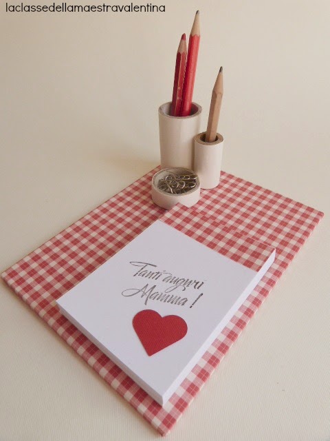 Detto questo, con una tavoletta di legno rifasciata, dei piccoli tubolari di carta e un piccolo blocchetto... ho realizzato un semplice regalino per mamma... i bambini possono pitturare e decorare il tutto con le pitture.