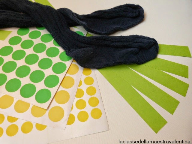 2 calzini, etichette rotonde (riciclo sanitario) e avanzi di cartoncino.