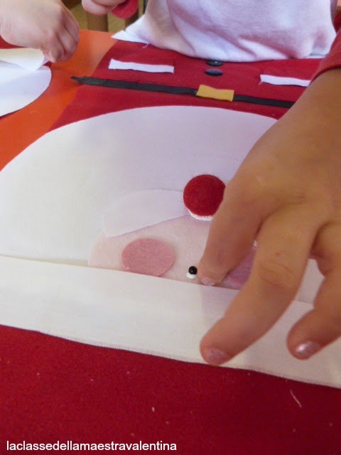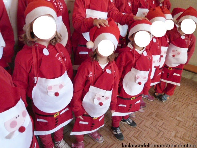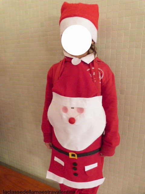 Con la mia magica rondella taglia stoffa ho ritagliato 25 sagome di babbi natale e ho messo subito al lavoro i miei bimbi... convinti di indossare questo grembiule per la recita.