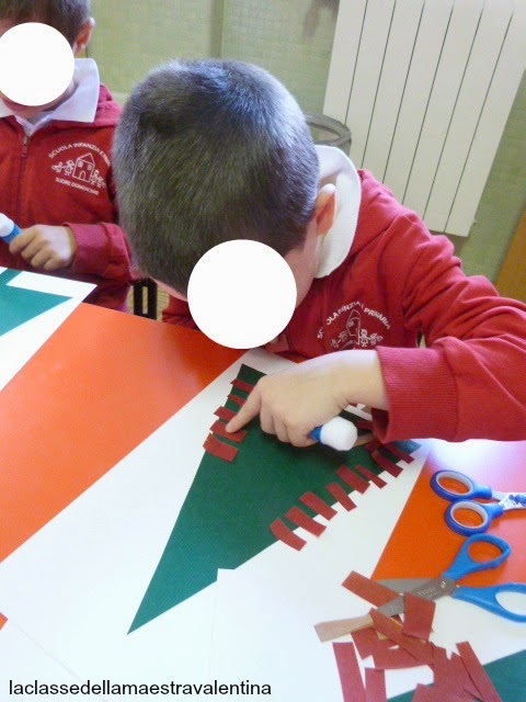Dopo aver preparato un albero (carta da pacchi verde) incollato su un cartoncino rigido, ho consegnato ai bambini degli avanzi di carta da pacco rossa.