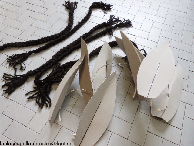 Code fatte con avanzi di lana intrecciate e le orecchie d'asino fatte con archetti di fil di ferro e cartoncino.