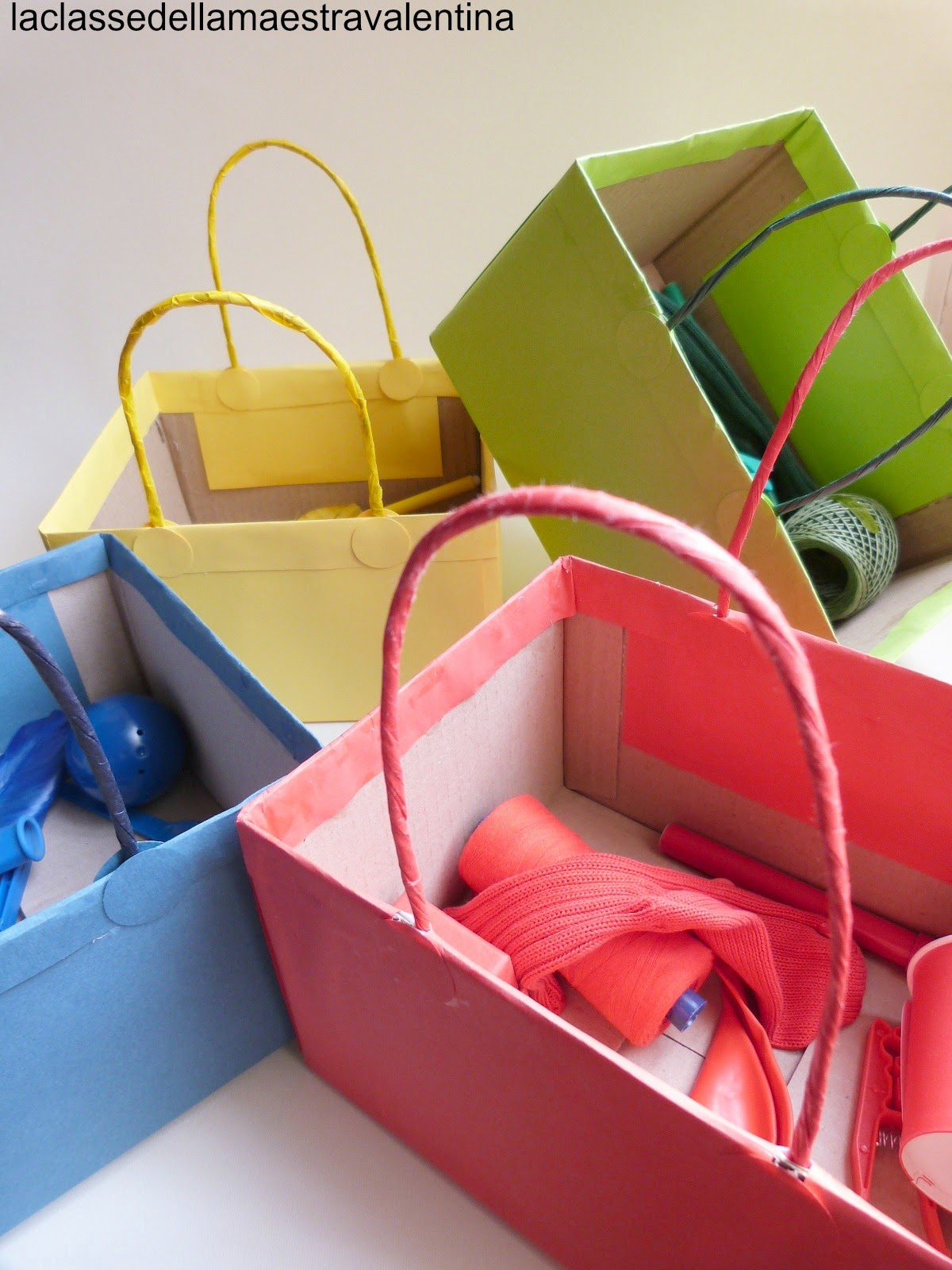 Con 4 scatole, rifasciate, ho fatto i secchiellini porta oggetti.