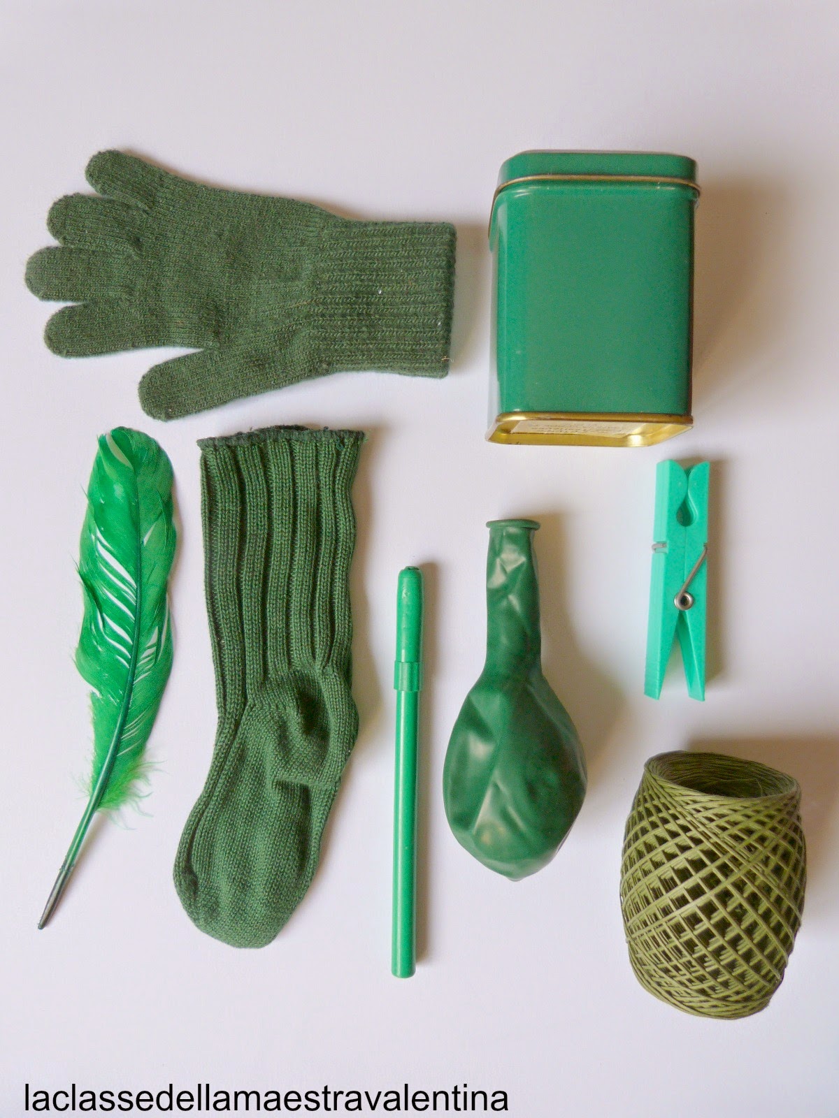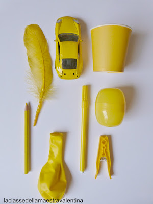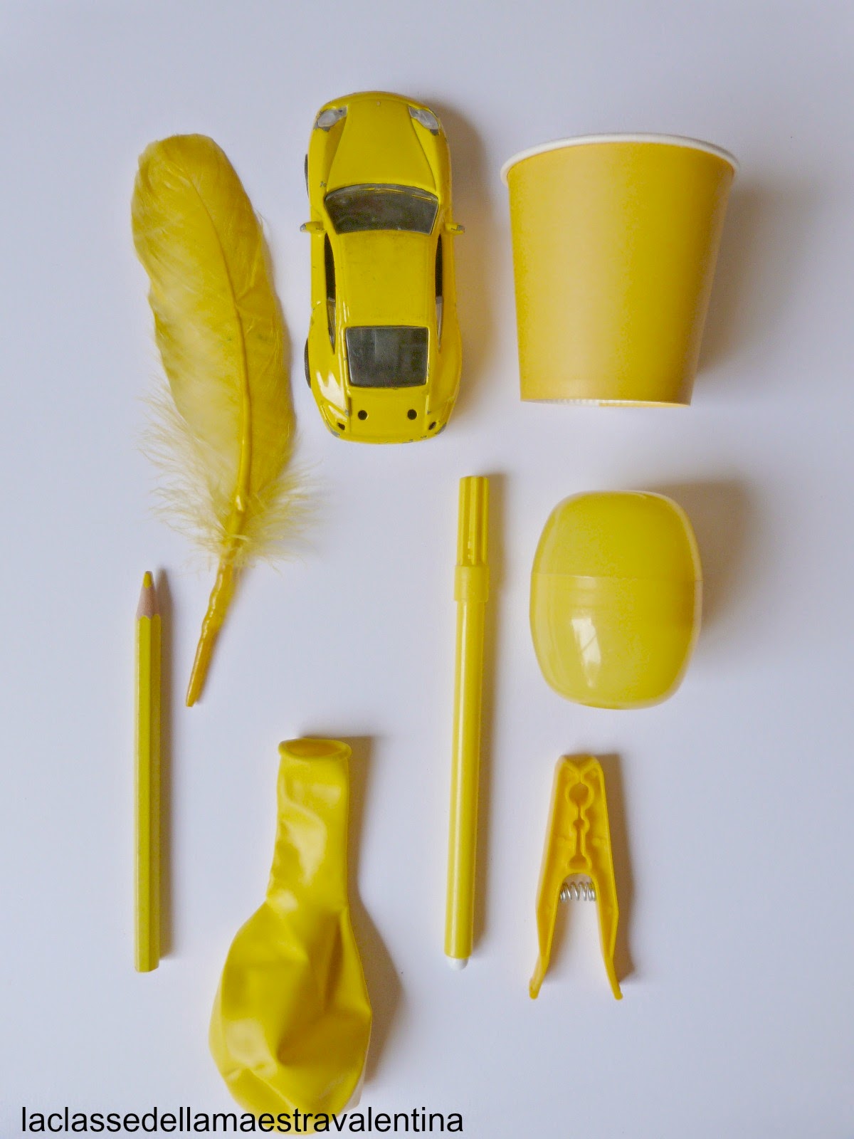 Ho cercato degli oggetti di colori stabiliti, ho fatto le foto e le ho incollate su una base rigida.