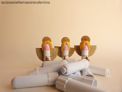 Care creative, oggi vi faccio vedere come dei tappi di pennarelli bianchi possono trasformarsi in piccoli angioletti.                                                     Possono decorare l'albero di Natale o diventare dei segnaposti.